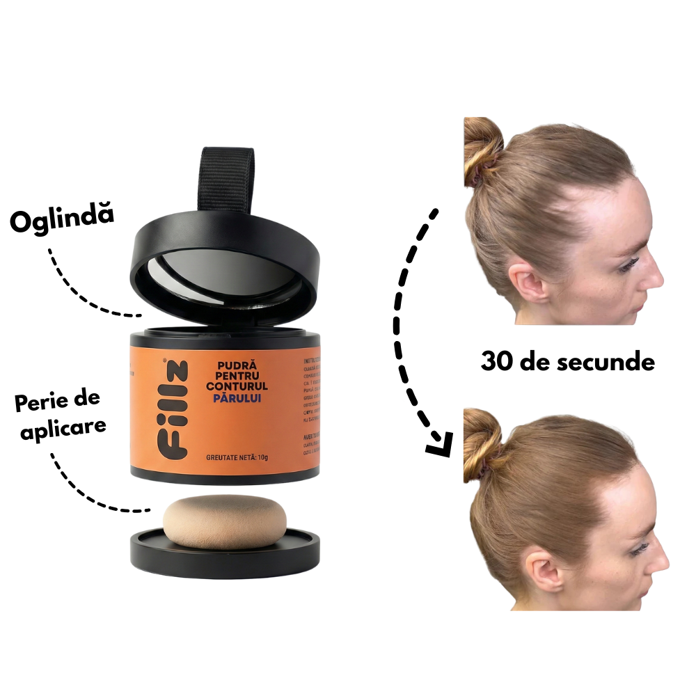 Fillz este pudra pentru păr creată special pentru femei, care acoperă instant rădăcinile crescute, firele albe și zonele cu păr rar.